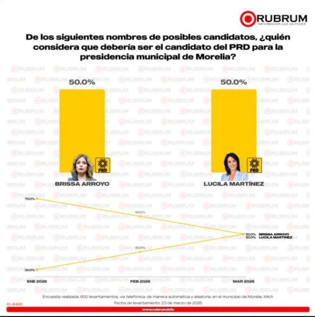 Morelia, Michoacán, 22 de abril de 2026.- En política, las tendencias no mienten. Podrán matizarse, interpretarse o incluso cuestionarse, pero cuando una trayectoria es consistente, termina por imponerse. Eso es precisamente lo que refleja la más reciente medición de preferencias del PRD rumbo a Morelia en el 2027, elaborada por la encuestadora Rubrum: el crecimiento de Lucila Martínez no solo es evidente, es sostenido.